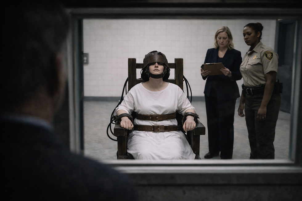 From behind the glass, a sound. A muffled sob—not from the victim's family, but from the chaplain. His hand went to his mouth, his eyes closing, his shoulders shaking. The young reporter looked away, his face green. Even the warden's mask slipped for just a moment, his jaw tightening, his eyes dropping to his clipboard.