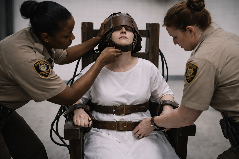 They turned her around. She felt the wood against the back of her knees—cold, so cold—and then she was sitting. The cuffs came off her wrists, and before she could rub the ache away, her arms were being strapped to the chair. Leather across her chest, pulled tight. Leather across her waist, tighter still. Leather around each wrist, around each ankle, around her thighs. With each strap, she felt herself becoming less a person and more an object, a thing to be processed.